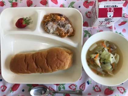 とうふのミートグラタン、じゃがいもと野菜のスープ、いちごです。