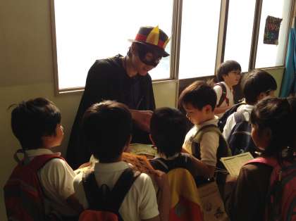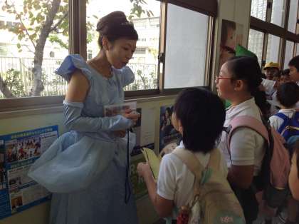 学校のいろいろな場所に、仮装した教職員や