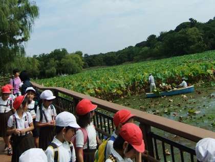 遊んだ後は自然観察です。蓮が池に広がっていました。作業をしていた方々に子どもたちはいくつか質問をすることができました。