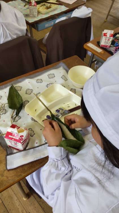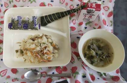 混ぜて食べるきんぴらちらし、すまし汁とちまきです。