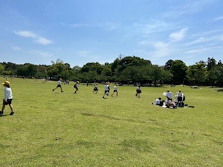おやつを食べた後は、誰の合図で始まるでもなく、草原を駆け出す者あり、だるまさんが転んだを始める者あり。自然を満喫しております。