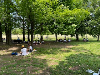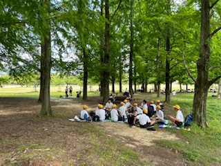 木陰でお弁当タイムです。ちょうど曇ってきて、陰が心地よいです。みんなそれぞれのお弁当を見て、笑顔が溢れています。