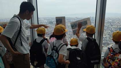 3年生の社会科では、自分たちが住んでいる大阪市について学びます。今日はあべのハルカスに行き、60階の展望スペースから大阪市を見渡しました。地図上で見つけた建物や施設を、東西南北それぞれの方角から確認することができました。