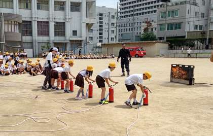 今日は、土曜授業「防災day!」の日です。講堂では区役所の方による防災講話、運動場では水消火器体験と煙テント体験、教室では社会福祉協議会の方によるオンライン講話を実施しました。年に1回の「防災day!」ですが、毎年行うことで、児童の防災に対する意識が高まってきています。体験活動の後は、引き渡し訓練もありました。保護者の皆様と有事の際の引き渡しの流れを確認することができました。