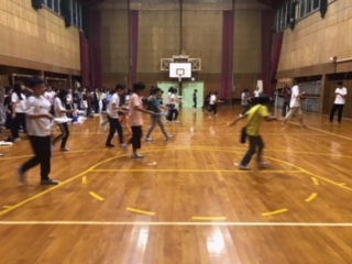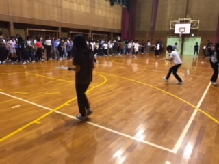 残念ながら雨天でキャンプファイヤーができないため、体育館でレクリエーションを楽しんでいます。