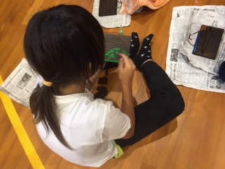 焼き板に絵を描いています。