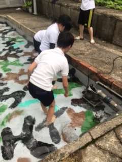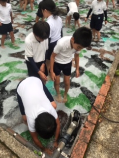 飯盒炊爨の後片付けも終わり、次は魚つかみです。今日は、ヤマメとアマゴが放流されています。