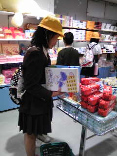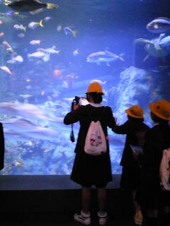 大きな水槽前での写真とお土産を選んでいる様子です。みんな元気です。