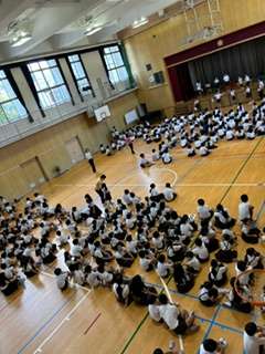 朝の児童集会の時間に、たてわり班でゲームに取り組みました。