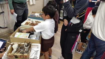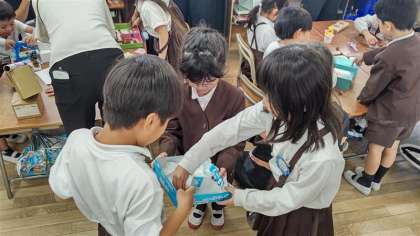 1年生の生活科の学習です。秋みつけで見つけた材料をつかっておもちゃづくりをしています。自分の設計図をもとに試行錯誤しながらおもちゃづくりに没頭していました。出来上がると友だちに見せにいって一緒に遊んだり、遊びながらおもしろい遊び方を見つけたりする姿が見られました。できあがったら、秋のおもちゃのお店を開くそうです。