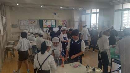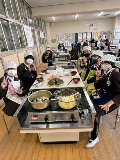 5年生の調理実習の様子です。ごはんとお味噌汁を作りました。中身が見えるガラス製の鍋を使ってごはんを炊き、その様子を観察しました。どの班もおいしく炊き上がりました。