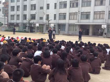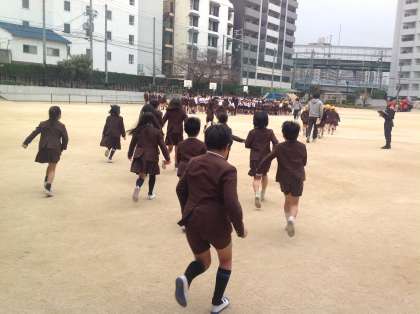 放送をよく聞いて、全校児童が4分で