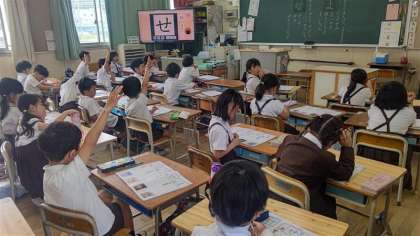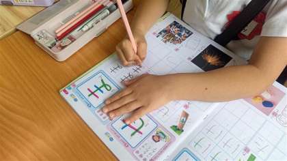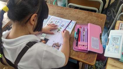 1年生のひらがなの学習です。書き方やその文字を使った言葉を確認したあと、ノートに練習をします。鉛筆の持ち方もとても上手になりました。整った字を書く習慣が身に付いてきています。