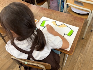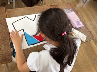 2年生の教室をのぞくと、真剣に、そしてとても楽しそうにTシャツの色を塗ったり模様を描いたりしていました。