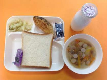 今日の給食は「食パン、ブルーベリージャム、牛乳、サーモンフライ、スープ、サワーソテー」です。