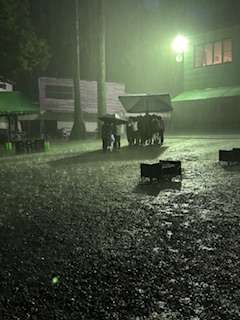 キャンプファイヤー場に集合したら、大雨が降ってきました。