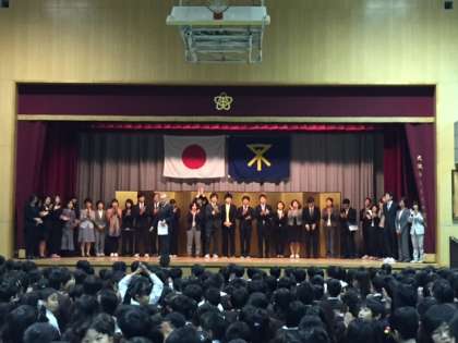本田小学校の教職員全員、舞台に全員集合です。これから1年、がんばります。