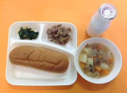 今日の給食は「黒糖パン、牛乳、豚肉のカレー風味焼き、じゃがいものスープ煮、ほうれん草とコーンのソテー」です。