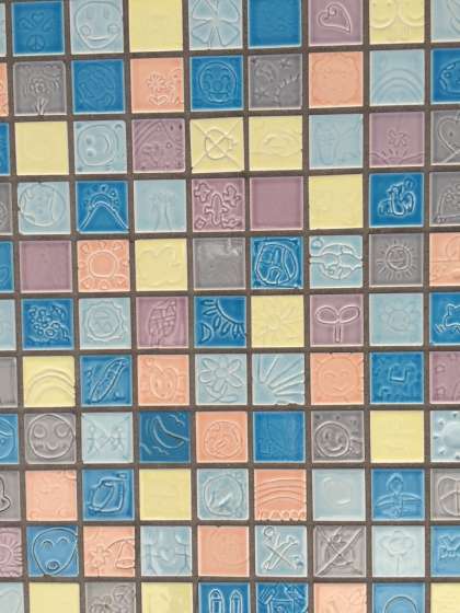 『刻(とき)の庭』の壁にはいろいろなマークが