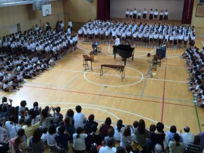 本田小学校の講堂に、子どもたちの歌と手拍子が