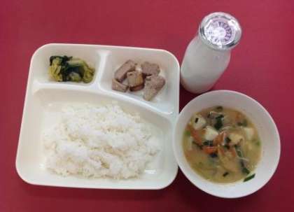 今日の給食は「ご飯、牛乳、まぐろのしょうゆバター焼き、みそ汁、はくさいとほうれん草の煮びたし」です。