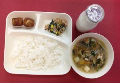 今日の給食は「ご飯、牛乳、あげシューマイ、とうふのスープ、ツナとチンゲンサイのいためもの」です。
