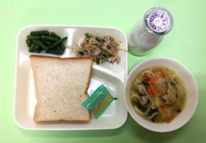 今日の給食は「食パン、りんごジャム、牛乳、五目うどん、豚肉と野菜のいためもの、三度豆のからしあえ」です。