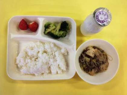 今日の給食は「ご飯、牛乳、すき焼き煮、ブロッコリーのしょうがづけ、いちご」です。