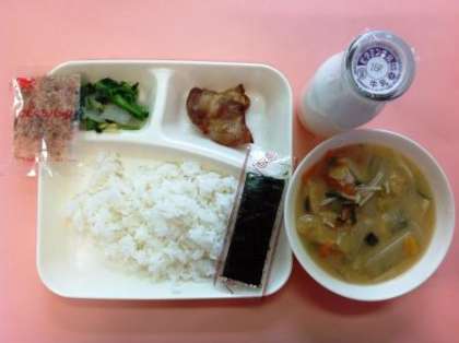 今日の給食は「ご飯、牛乳、鶏肉のゆず塩焼き、みそ汁、菜の花のおひたし、焼きのり」です。