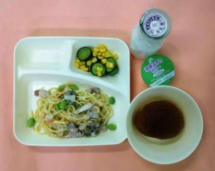今年度最後の給食は、みんなの大好きなスパゲッティ。バターと小麦粉をじっくり炒めて作ったホワイトルウで仕上げたクリームスパゲッティです。