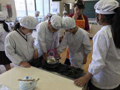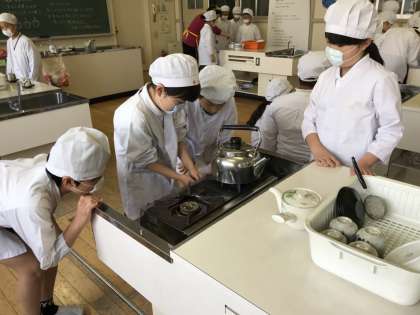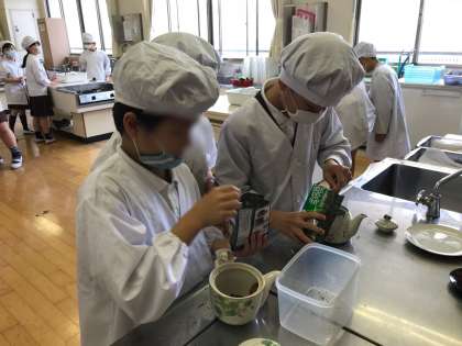 5年生は、初めての調理実習に取り組みました。家庭科室の使い方、お茶の入れ方を確認して手をきれいに洗ったら、いよいよ実習開始。まずは人数分の茶葉を急須に入れます。ティースプーン1杯が1人分。真剣な表情で数えながら入れました。水をやかんにくんでガスコンロにのせ、次は点火です。ガス栓を開き、点火つまみをカチリ。「先生、つけへん!」と慌てていた班も、何度か挑戦するうちに自分たちでつけることができました。