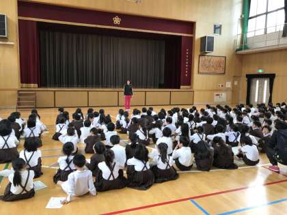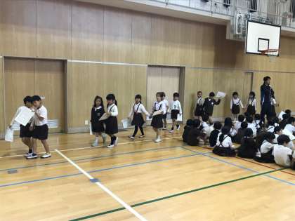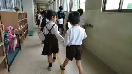 2年生が1年生の手を繋いで、学校のいろいろな場所を案内しました。