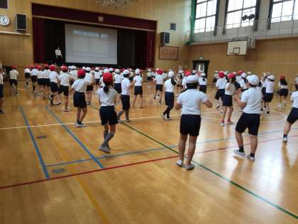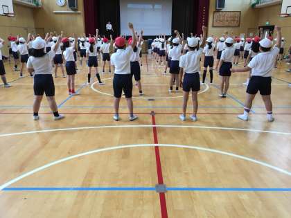 昨日からのまとまった雨は上がりましたが、パラパラと降ったり止んだり…運動場の状態もあまりよくないので、体育館で運動会の練習を行っています。4年生はエイサーに取り組んでいます。