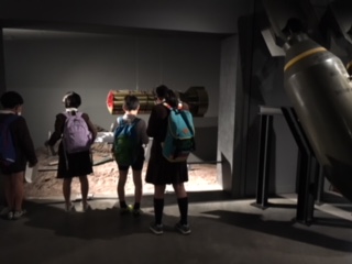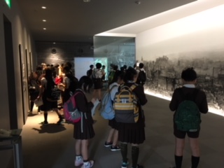 朝からパラパラと降っていた雨も学校を出るころにはすっかり止み、ピース大阪に着いた時には晴れ間も見え始めました。ピース大阪の見学はグループ毎に行いました。グループに1台タブレットを持って、写真をとったり、メモをとったりしました。大阪も戦争の甚大な被害を受けていたことにしっかりと目を向け、平和の大切さを考えました。後半はホールに集まり、短編映画を見ました。