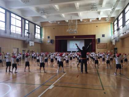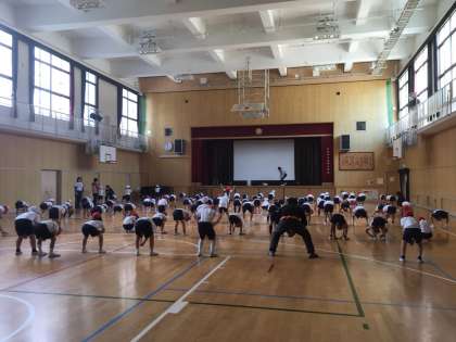 運動会の練習が始まっています。写真は、ダンスの練習です。WANIMAの「やってみよう」の曲に合わせて、元気一杯踊っています。
