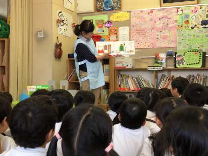 図書室で本を借りました。たくさんの本があり、何を借りようかみんな悩んでいました。写真は図書室の先生に読み聞かせをしてもらっている様子です。