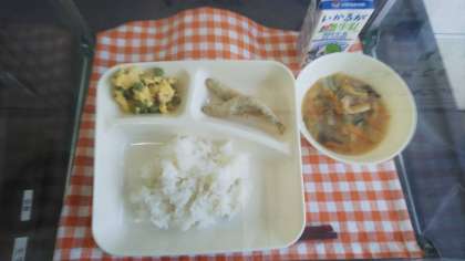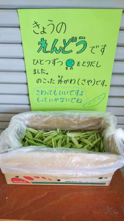 今日は、一年に一回のえんどう豆が出ました。朝からさやをひとつひとつむいて、おいしいおかずができました。むいたあとのさやを子供たちにも見てもらいました。えんどうの卵とじになりました。