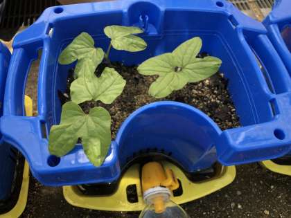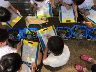 アサガオの芽が出ました。写真は、生活科の学習として、観察している様子です。「葉っぱは、ちょうちょの形に似ているね。」など、様々な気付きがありました。