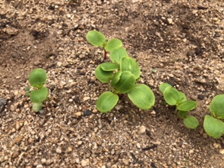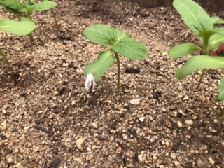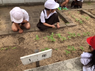 1年生の学習園では、マリーゴールド、百日草、ひまわり、ほうせんかを育てています。まいた種が芽を出し、少しずつ大きくなっています。