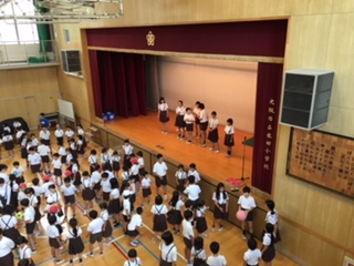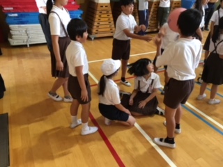 集会委員会による「爆弾ゲーム」をしました。グループで輪になり、音楽に合わせてボールを回します。音楽が止まった時点でボールを持っていた人はアウトです。さあみんなでサバイバル!