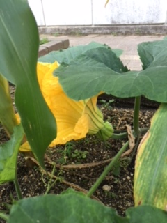 児童朝会の後、5年生が学習園前に集まりました。育てているかぼちゃととうもろこしが見事な花を咲かせています。「かぼちゃもとうもろこしも雄花と雌花があり、雌花のほうに実がなります。かぼちゃの花にははなびらがあり、とうもろこしの花にはありません。なぜだかわかりますか?受粉の方法が違うのです。」みんな感心して話を聞いていました。写真からどれが雄花か、どれが雌花かわかりますか?