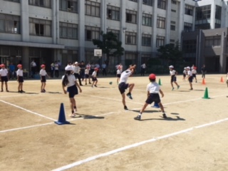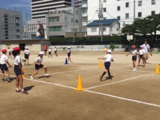 筑波大学附属小学校から齊藤直人先生を招き、体育科公開授業研究会を行いました。5時間目は、3年3組が運動場で「はしごドッジボール」の授業をしました。6時間目は齊藤先生が6年3組で「高跳びとフライングディスク」の授業を行いました。とても暑い中、又たくさんの先生方が参観に来られている中、子供たちは声を出して、活発に動いていました。