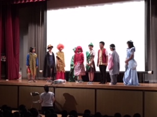 今日の集会は代表委員会による創作劇の発表でした。本田桃太郎が、孫悟空やシンデレラ、ピーターパンといった仲間と一緒に本田小学校をよくしていこうとする物語です。途中、転校生の「鬼が島ブラザーズ」が本田小学校のルールを破ろうとしますが、勇猛果敢に本田桃太郎たちは立ち向かいます。「はしら〜ない!ひろがら〜ない!さわが〜ない!」みんなで本田小学校をより良い学校にしていきましょう!