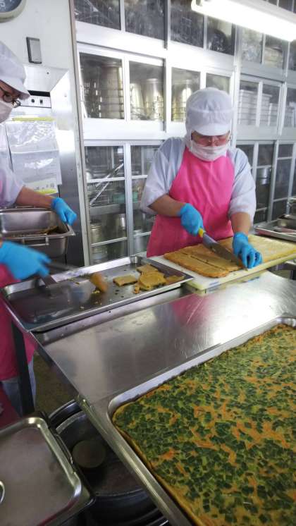 今日の献立にチヂミがあります。40度にもなる給食室で、鉄板で焼いてから切り分けていきます。美味しく頂いて、暑さに負けない体力をつけましょう!