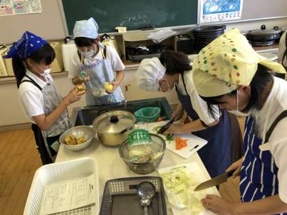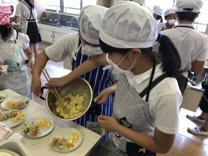 〜朝食のおかずを作ろう〜ということで、調理実習を行いました。先日それぞれが作ったエプロンを着て、野菜炒め、粉ふきいも、卵料理(スクランブルエッグ、卵焼きなど)を作りました。3品同時に作るのは大変でしたが、みんなで協力することができました。じゃがいもは、学習園で収穫したものです。