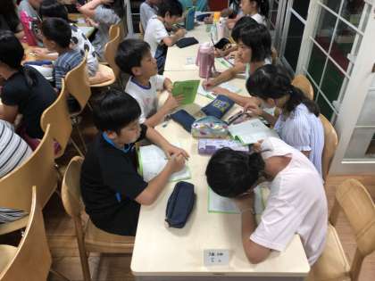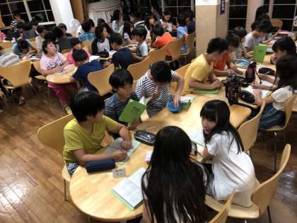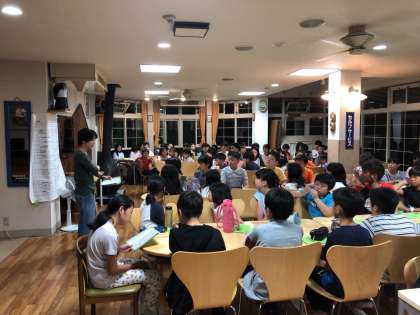 今日の振り返り、活動班の反省点、明日の課題について話し合いをしています。みんな、よい林間学習になるように、活発に話し合いを進めることができています。