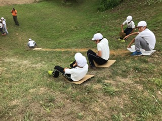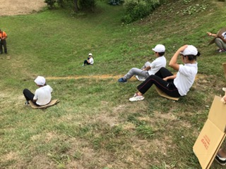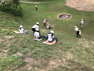 宿舎の横の斜面でダンボールを敷いてすべります。せーの !の掛け声でみんなで滑りました!