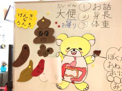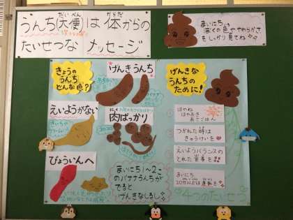 その時間に、1年生から4年生は「体からの大切なお便り〜うんちくんからのメッセージ〜」についてお話をしました。