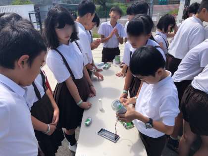 エネルギー実験のグループです。地球環境にやさしいエネルギーの活用について学びました。