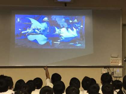 電子黒板に絵本を映し出し、BGMに合わせた映像の絵本の世界を楽しみました。